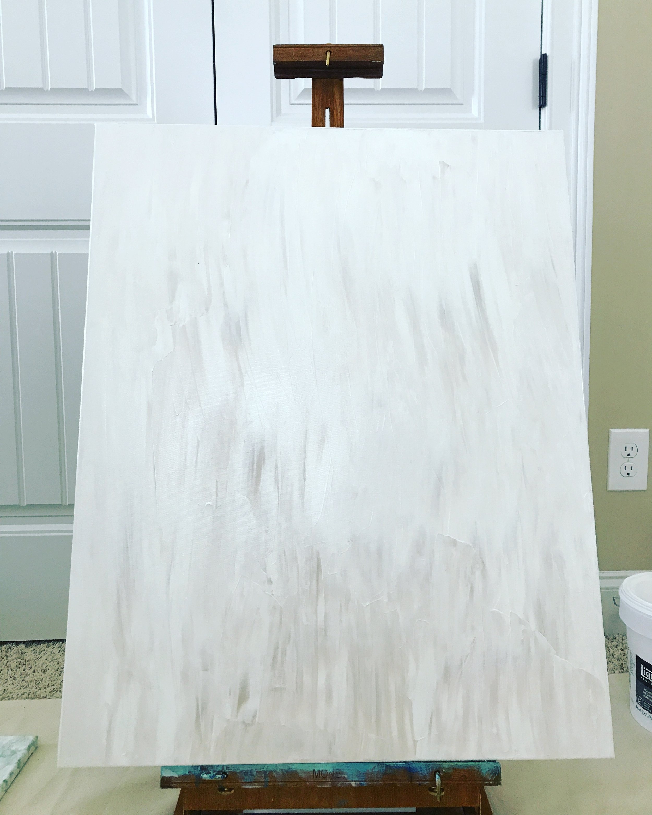A blank canvas can often be intimidating, artist and non-artist alike. I think I can safely say that we have all been there. I personally prefer to start most works, with the exception of fluid acrylics, with a coat of titanium white and dark titanium white. Sometimes, I even add a little gray. I apply everything with a large brush or palette knife to give the painting that bit of texture and movement before I even really begin to start the real work.